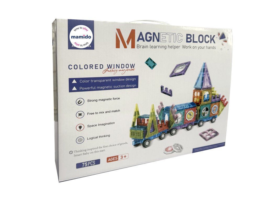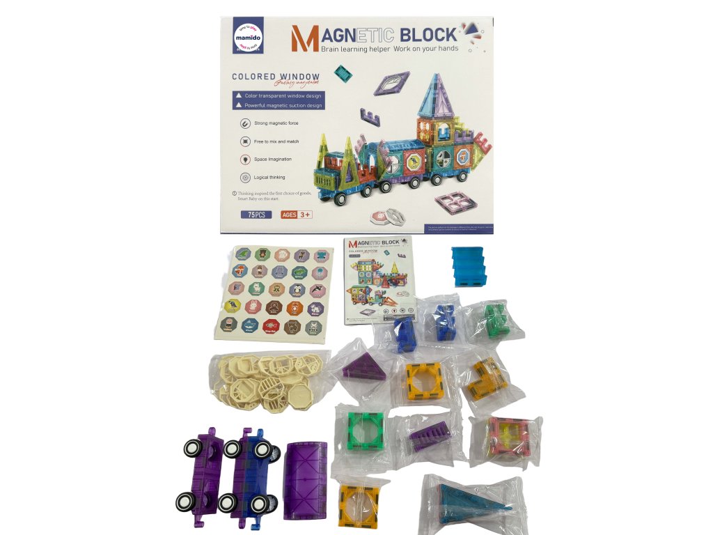 Kreativní magnetická stavebnice umožní dětem sestavit barevné stavby, vozidla a originální konstrukce díky 75 průhledným dílkům. Součástí sady jsou také kolečka, speciální okénkové panely a různé tvary, díky kterým si mohou děti vytvořit například vlastní magnetický vláček nebo dopravní soupravu.