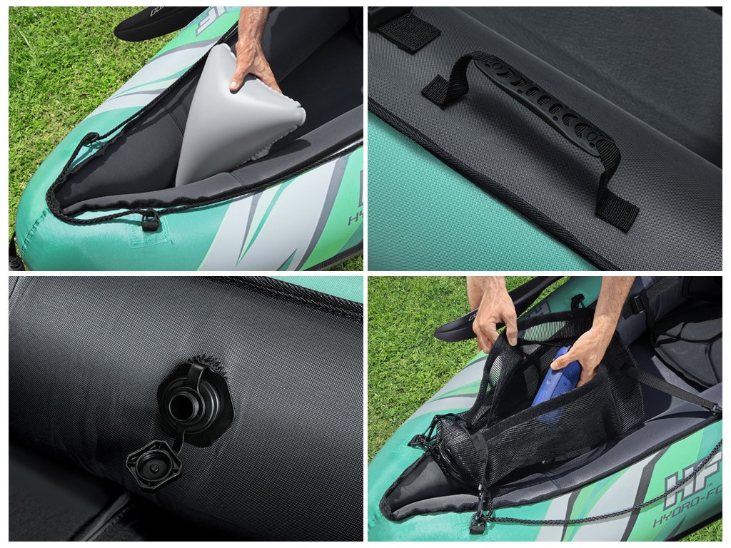 Kajak disponuje také pístovou pumpou, odnímatelnými ploutvemi pro stabilitu směru, bezpečnostním ventilem a odšroubovacími ventily pro rychlé nafukování/vyfukování, má konstrukci se třemi vzduchovými komorami. Použití vysoce kvalitních, moderních materiálů při výrobě zaručuje bezproblémový provoz a díky integrovaným přenášecím držadlům ho snadno přenesete.