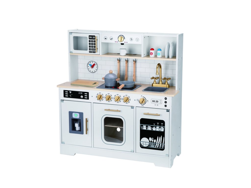 Tato dřevěná kuchyňka nabízí malým kuchařům skvělou příležitost prozkoumat svět vaření a péče o domácnost. Je vybavena realistickými prvky, jako je sporák se zvuky a otočnými knoflíky, mikrovlnná trouba, trouba s průhlednými dvířky, dřez se zlatými kohoutky a myčka. Díky tomu děti získávají autentičtější zážitek z vaření. Kuchyňka se snadno vejde do dětského pokoje díky svým kompaktním rozměrům 88 x 88 x 30 cm