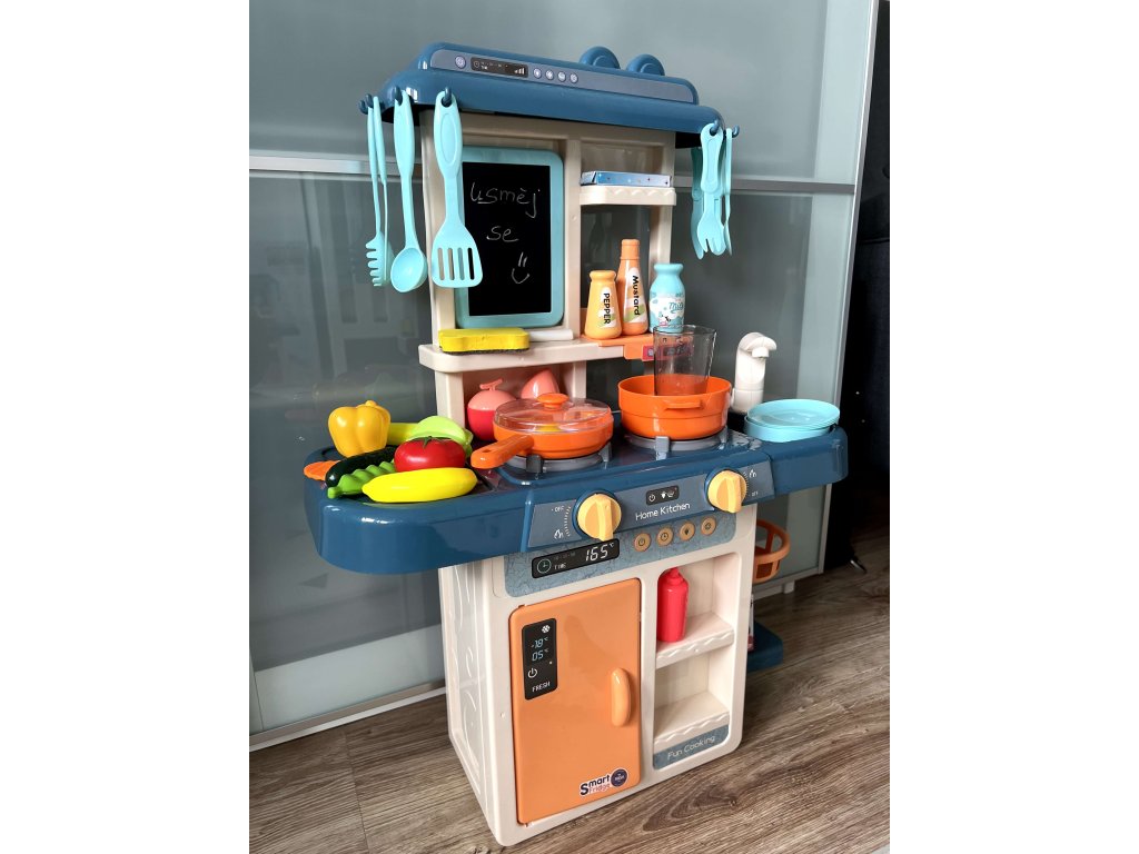 Dětská kuchyňská sada skladající se z 42 prvků. V kuchyni je umyvadlo s kohoutkem, ze kterého odtéká voda, dva indukční hořáky, pohyblivé knoflíky, otevíratelná lednička, police a spousta dalších kuchyňských doplňků. Po zapnutí hořáků na sporáku uslyšíte zvuky vaření, které je doprovázeno blikajícím červeným světlem. Zajímavým doplňkem je popisná tabule, na kterou můžete psát nákupní seznamy nebo recepty.