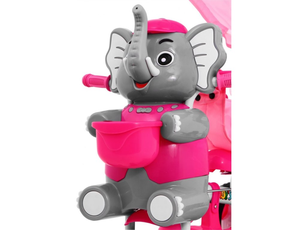 Dětská tříkolka nabízí úložný prostor na hračky nebo občerstvení pro dítě. Na hlavičce slona si může dítě hrát s tlačítky, které vydávají zvuky.