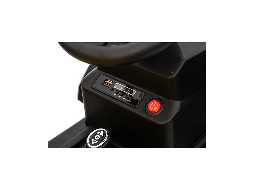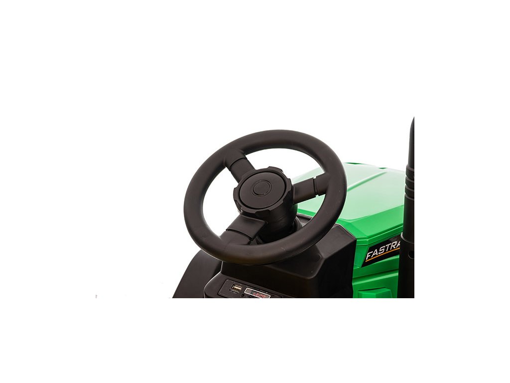 Pohodlné sedadlo s bezpečnostními pásy zajišťuje bezpečí dítěte během jízdy. Hudební panel s USB, AUX vstupem a slotem pro paměťovou kartu nabízí zábavu a interaktivitu. Přední světla přispívají k realističtějšímu vzhledu traktoru.