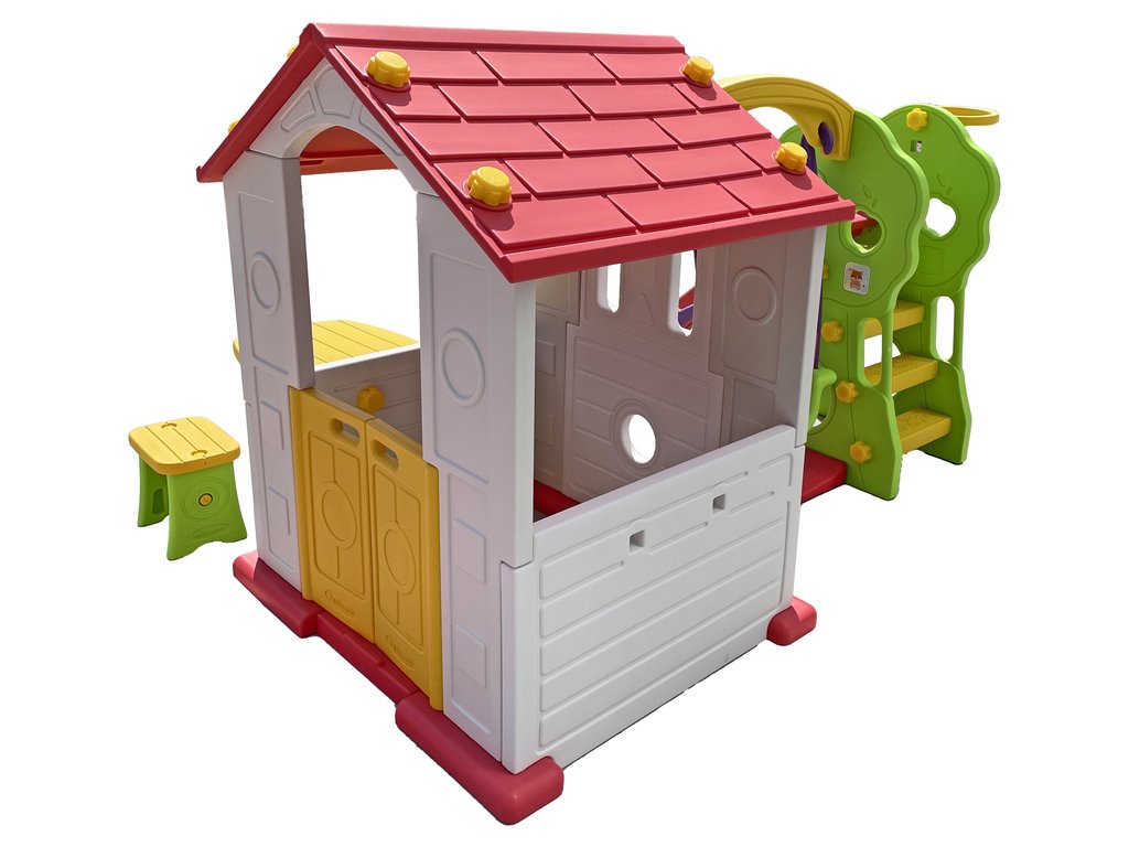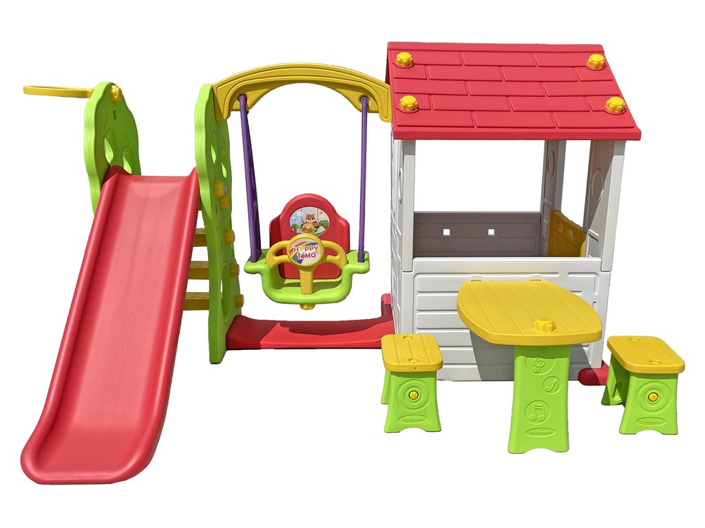 Představujeme Vám zahradní domek se skluzavkou a houpačkou, který je ideální pro hry na zahradě za pěkného počasí! Součásti sady jsou také dvě židličky se stolem a basketbalový koš s míčem. Sada je vyrobena z kvalitního plastu a zaručuje dětem dlouhotrvající a bezpečnou zábavu.