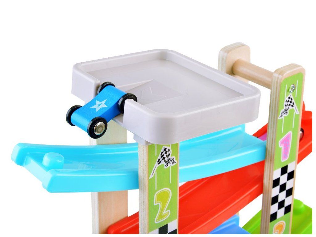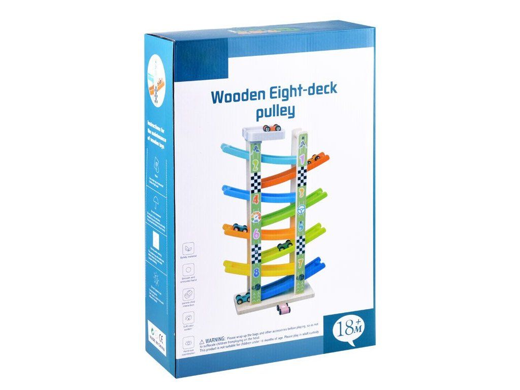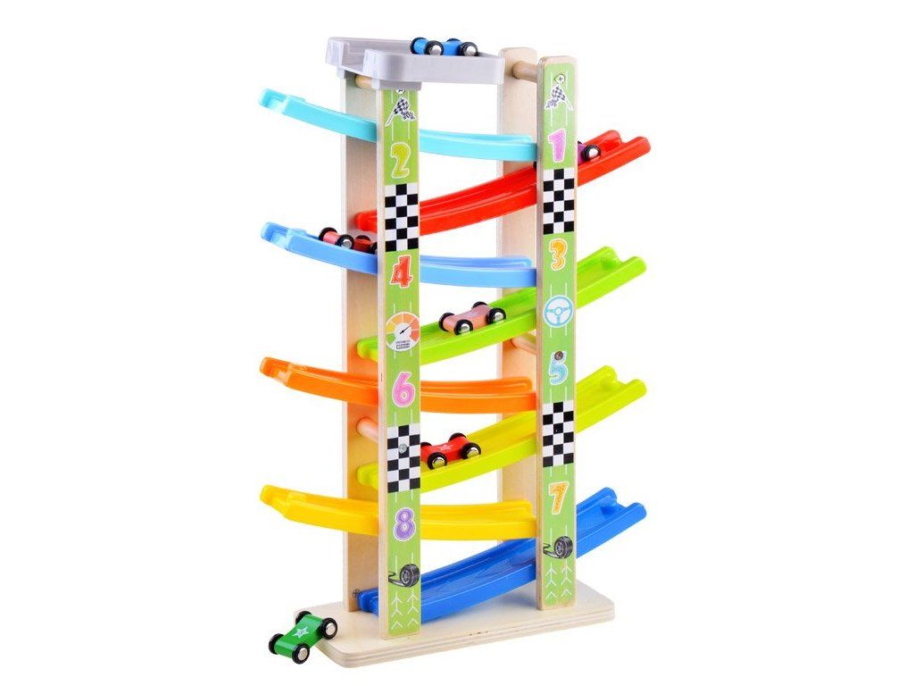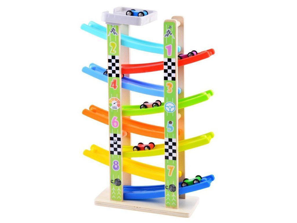Dřevěná autodráha s autíčky udělá radost každému dítěti. Věž se skládá z osmi pater, a každý z nich má jinou barvu. Hračka rozvíjí u dítěte motorické schopnosti a procvičuje koordinaci oko-ruka.