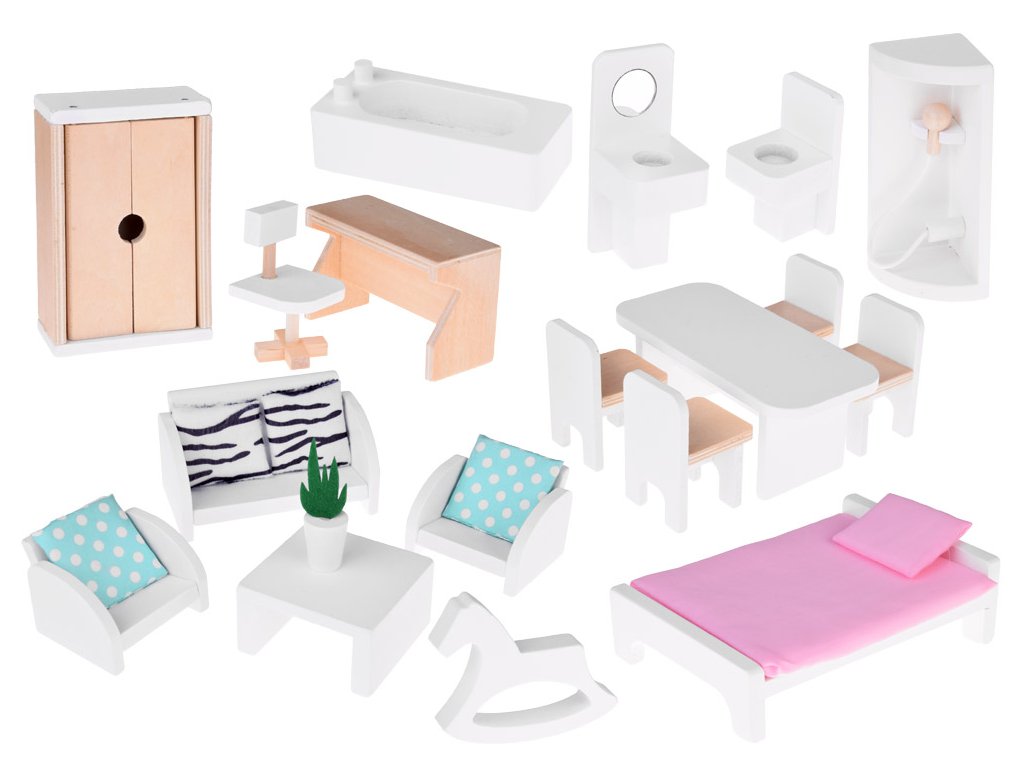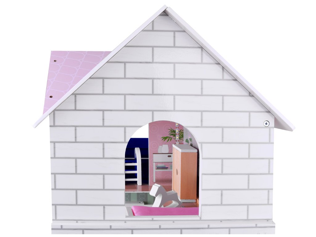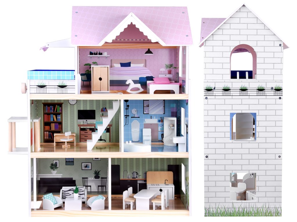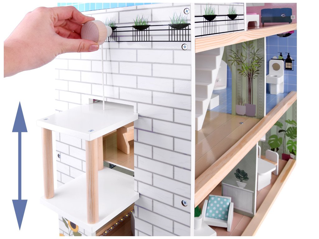 Dřevěný domeček pro panenky s nábytkem, výtahem, bazénem na terase splní očekávání každé dívky, která sní o vlastním domečku pro panenky. Vila má tři patra a pět prostorných místností. Do jednotlivých místností vede schodiště a pohyblivý výtah (schody a bazén jsou vyrobeny z plastu). Robustní konstrukce a bohaté vybavení zajistí dlouhou a báječnou zábavu pro každé dítě. Každá panenka a její hosté se v takové vile budou cítit příjemně.