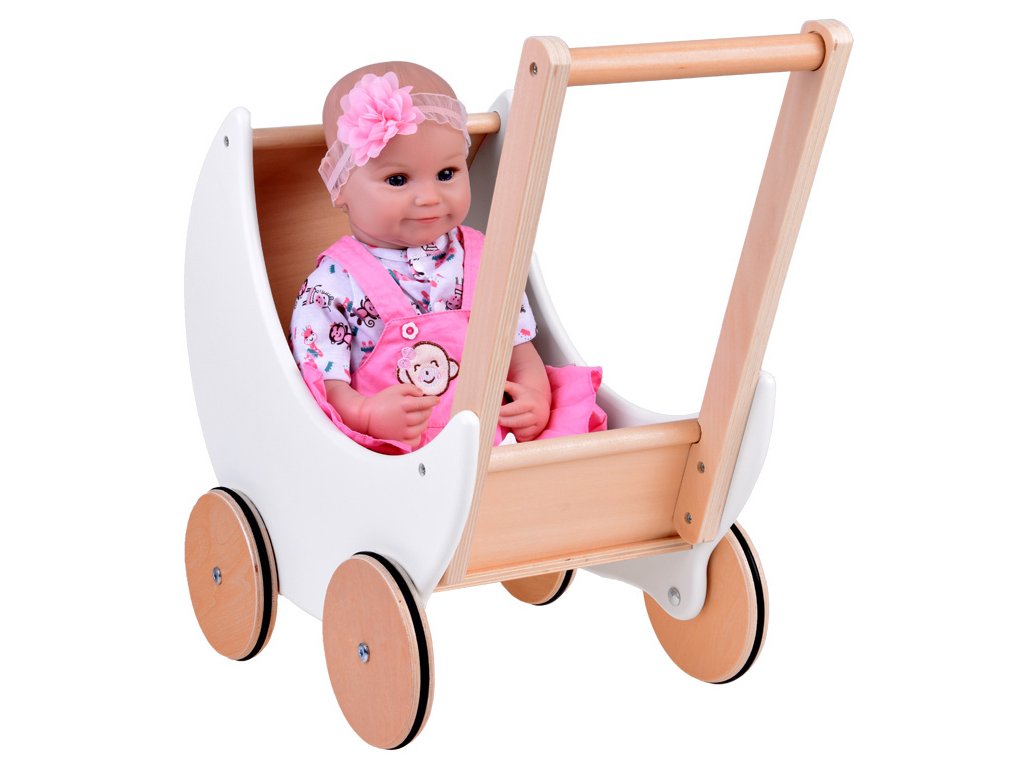 Kočárek je vybaven ergonomickým madlem přizpůsobeným malým dětským ručkám a pogumovanými kolečky, která nepoškrábou podlahu a zároveň tlumí hluk při jízdě. Všechny hrany jsou pečlivě zaoblené a opracované, aby hra byla naprosto bezpečná. Kočárek lze kromě vození panenek využít i jako praktický vozík na hračky nebo jiné drobnosti.