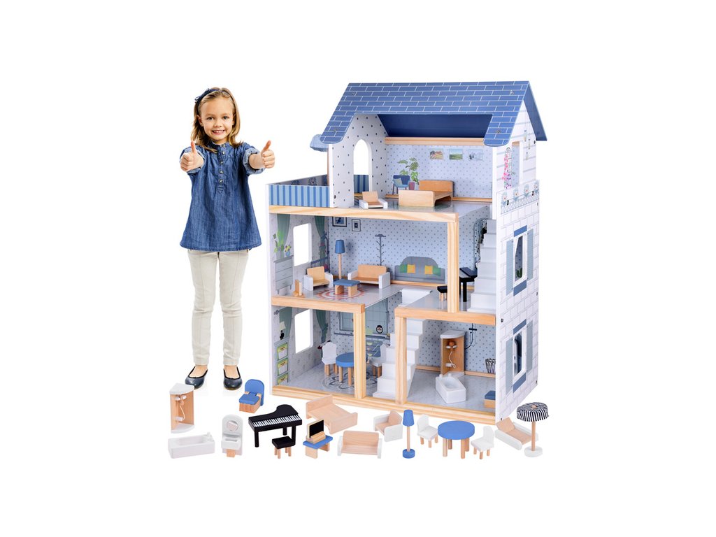 Dřevěný domeček pro panenky je splněným snem každé holčičky. Zvláště pokud není příznivcem růžové, tento tlumeně modrý domeček se jí jistě bude líbit.