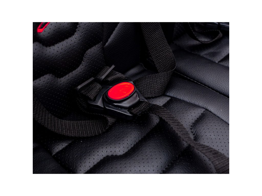 Autíčko můžete ovládat pomocí dálkového ovládání, které pracuje na frekvenci 2,4 GHz. Na dálkovém ovladači jsou tři rychlosti a bezpečnostní tlačítko STOP, které po zmáčknutí okamžitě zastaví autíčko. Sedačka je potažená eko kůží a nachází se na ní bezpečnostní pásy.
