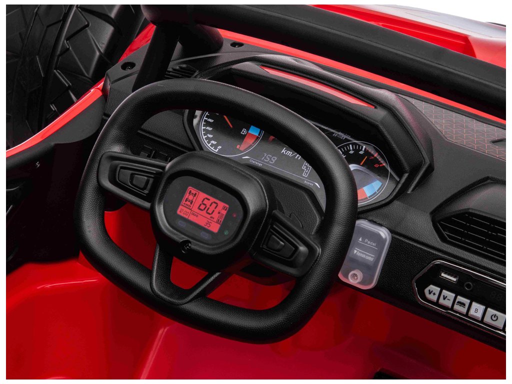 Autíčko můžete ovládat pomocí dálkového ovládání, které pracuje na frekvenci 2,4 GHz. Na dálkovém ovladači jsou tři rychlosti a bezpečnostní tlačítko STOP, které po zmáčknutí okamžitě zastaví autíčko. Sedačka je pokryta ekologickou kůží a nachází se na ní bezpečnostní pásy.