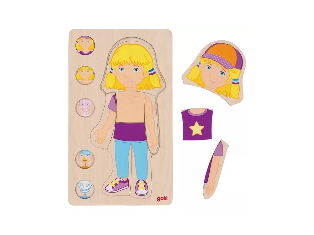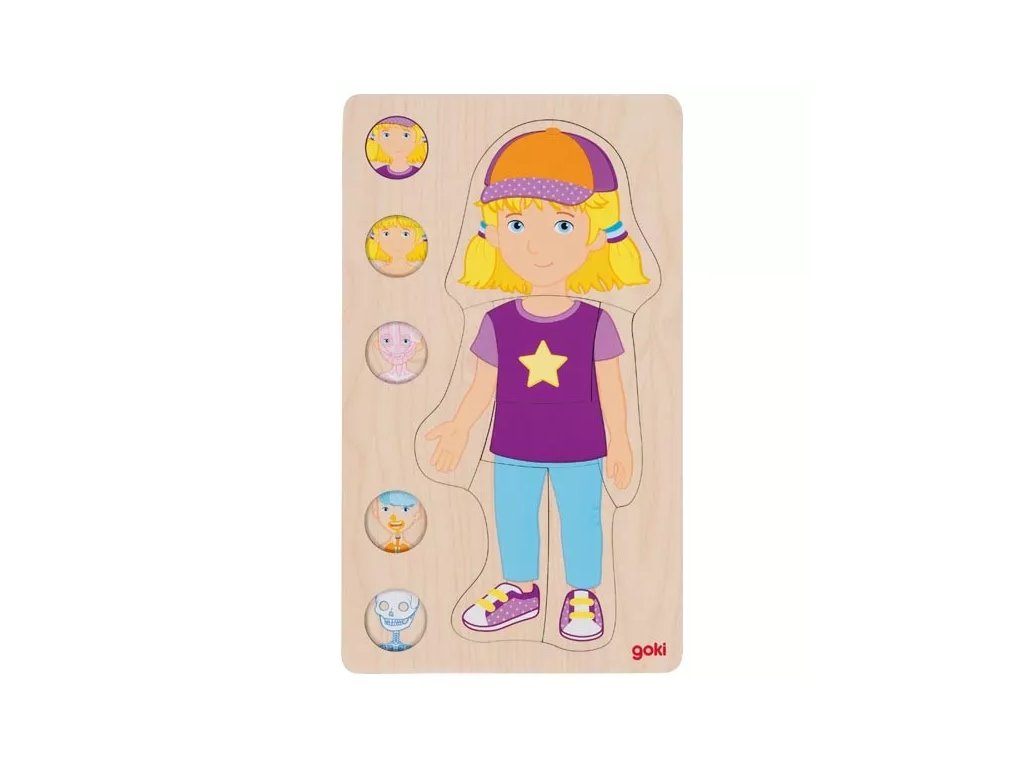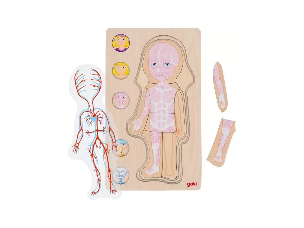 Vrstvené dřevěné puzzle od značky Goki ukazuje vnitřní strukturu lidského těla prostřednictvím pěti samostatných vrstev s ilustracemi. Dítě může rozložit figure až do jednotlivých dílků a složit ji zpět.