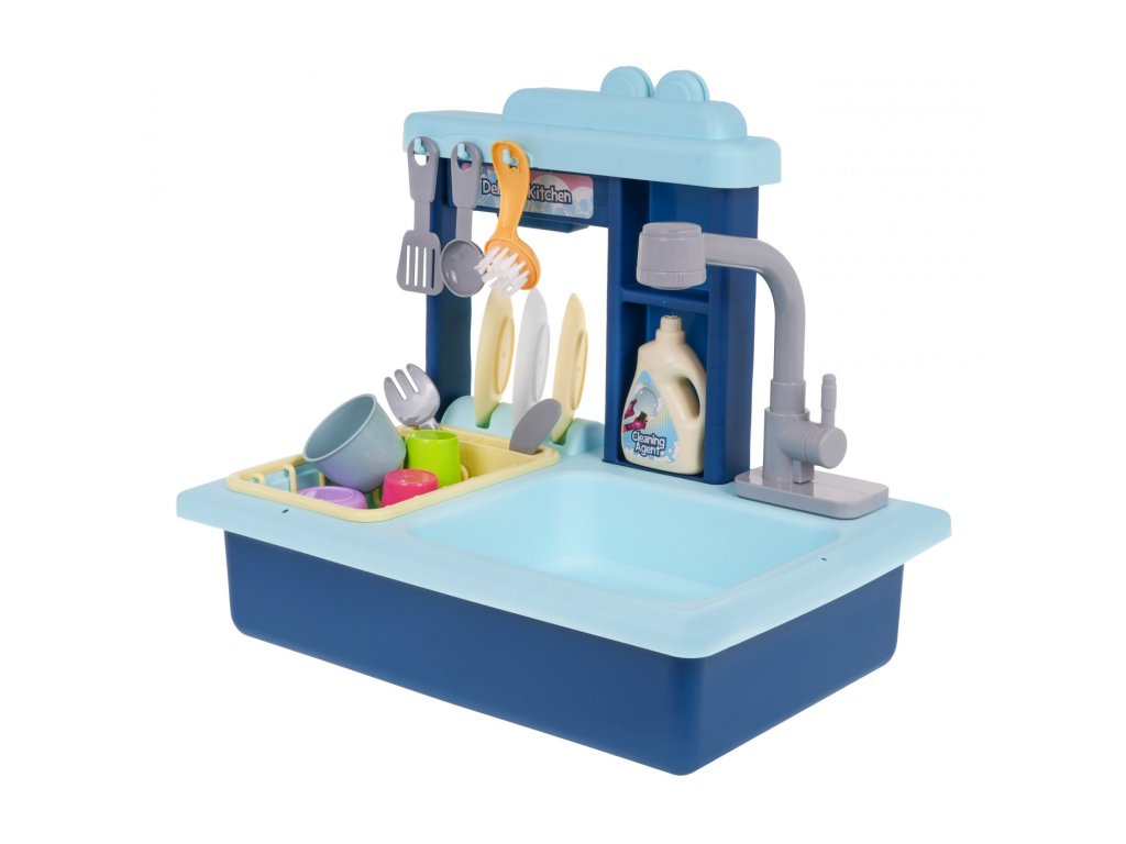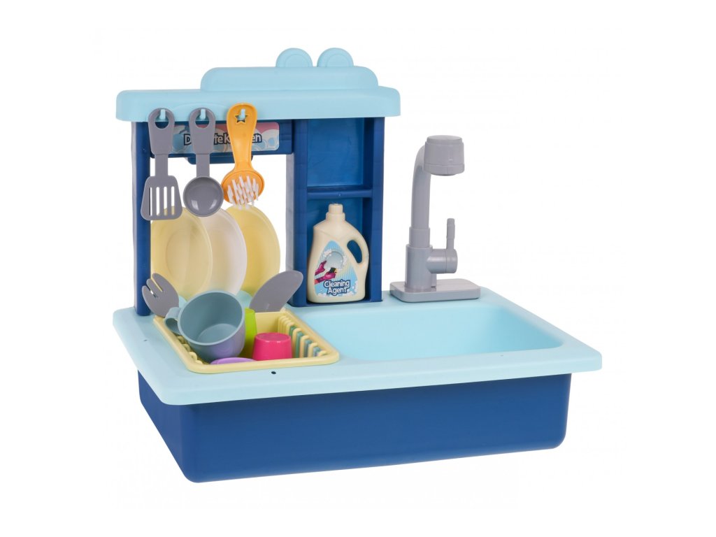 Kuchyňský dřez, který funguje jako skutečný, s četným příslušenstvím. Je určen pro děti od 3 let. Z kohoutku teče v uzavřeném okruhu jemný proud vody. Sada obsahuje mnoho "omyvatelných" doplňků.
