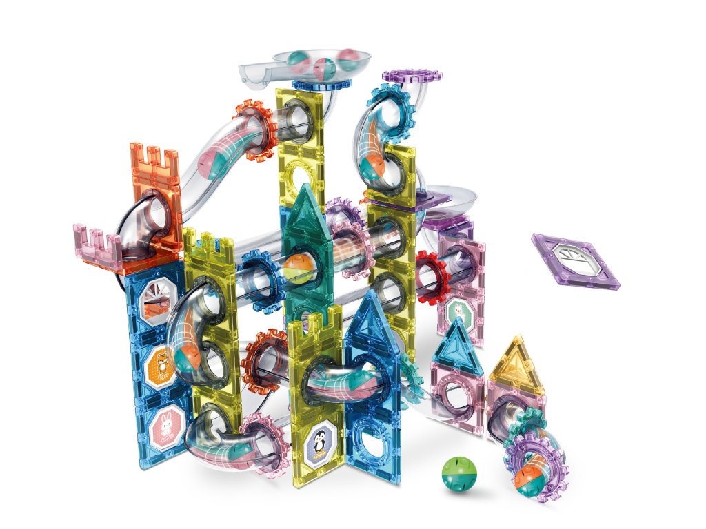 Prvky stavebnice mají silné magnety, které zajišťují stabilitu i u vyšších staveb. Díky bohaté škále dílků – čtverců, trojúhelníků, kol, dlouhých tunelů i rotačních prvků – si děti mohou stavět dráhy plné zatáček, průjezdů a spirál. Tato stavebnice skvěle rozvíjí logiku, kreativitu a jemnou motoriku.