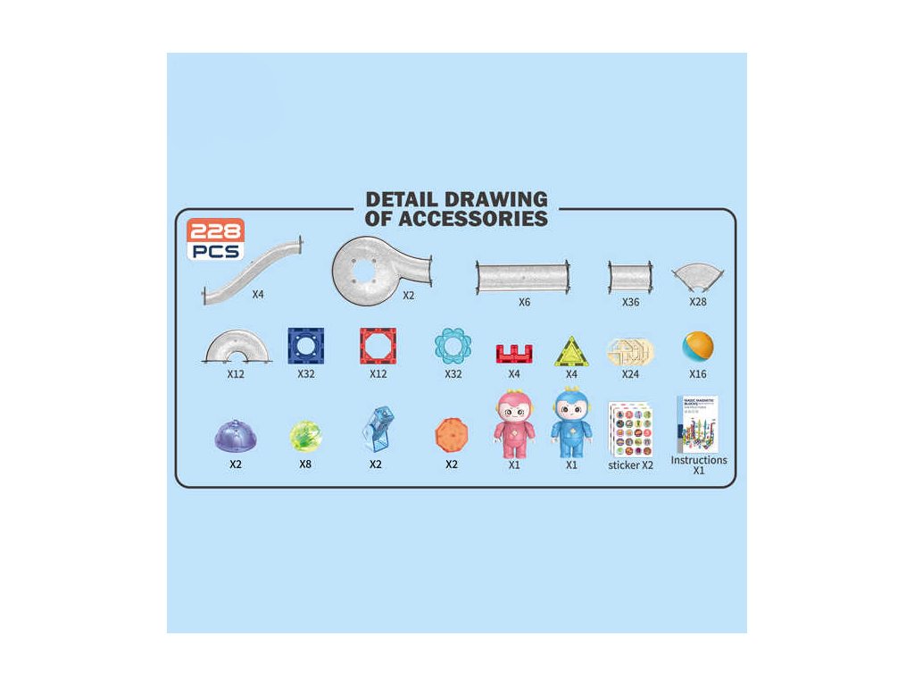 - Rozvoj kreativity: Sada obsahuje celkem 228 dílků různých tvarů a barev, včetně průhledných dílků, magnetických kuliček, průchodů a mnoho dalších příslušenství. To vše podněcuje dětskou kreativitu a fantazii.