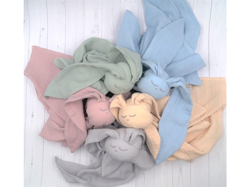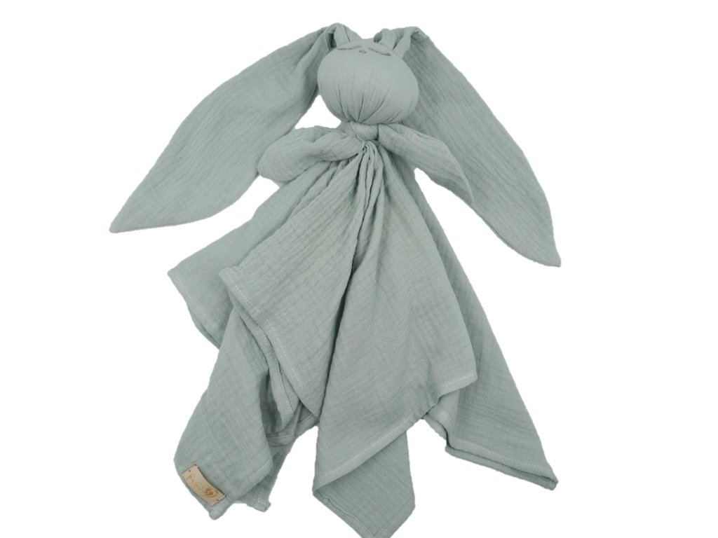 Na krku má králíček uvázanou ozdobnou mašličku, vyrobenou také z bavlněného mušelínu. Hug Me Bunny bude nenahraditelným přítelem při usínání a dokonalým společníkem pro dlouhé hry.