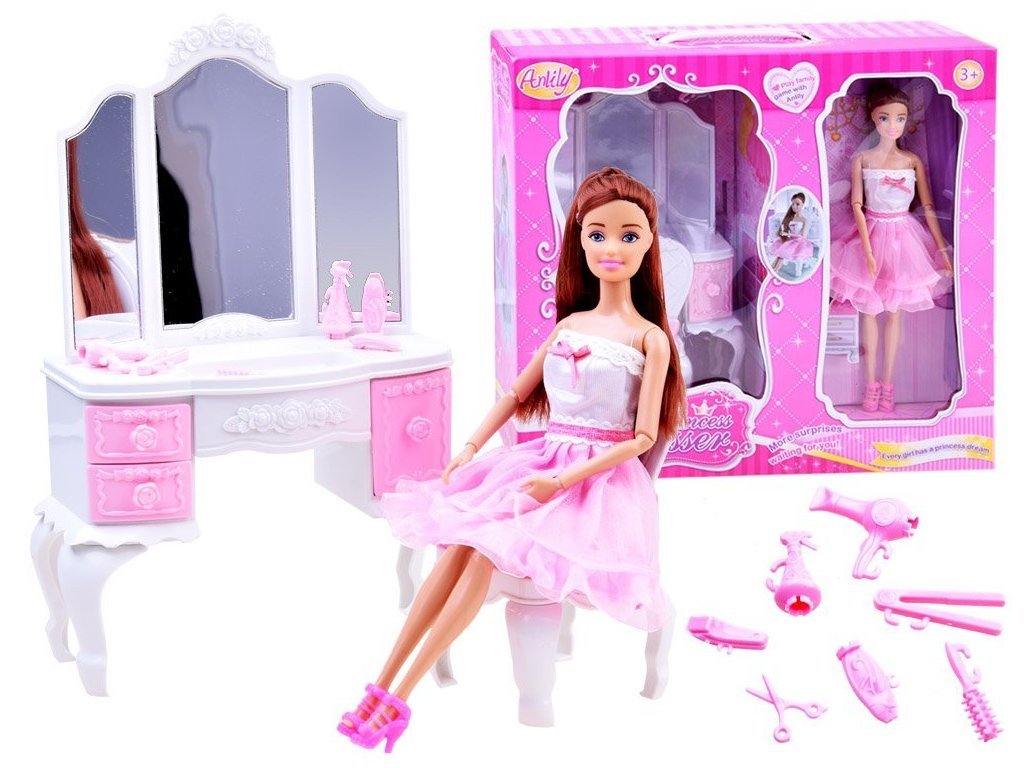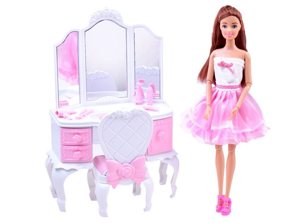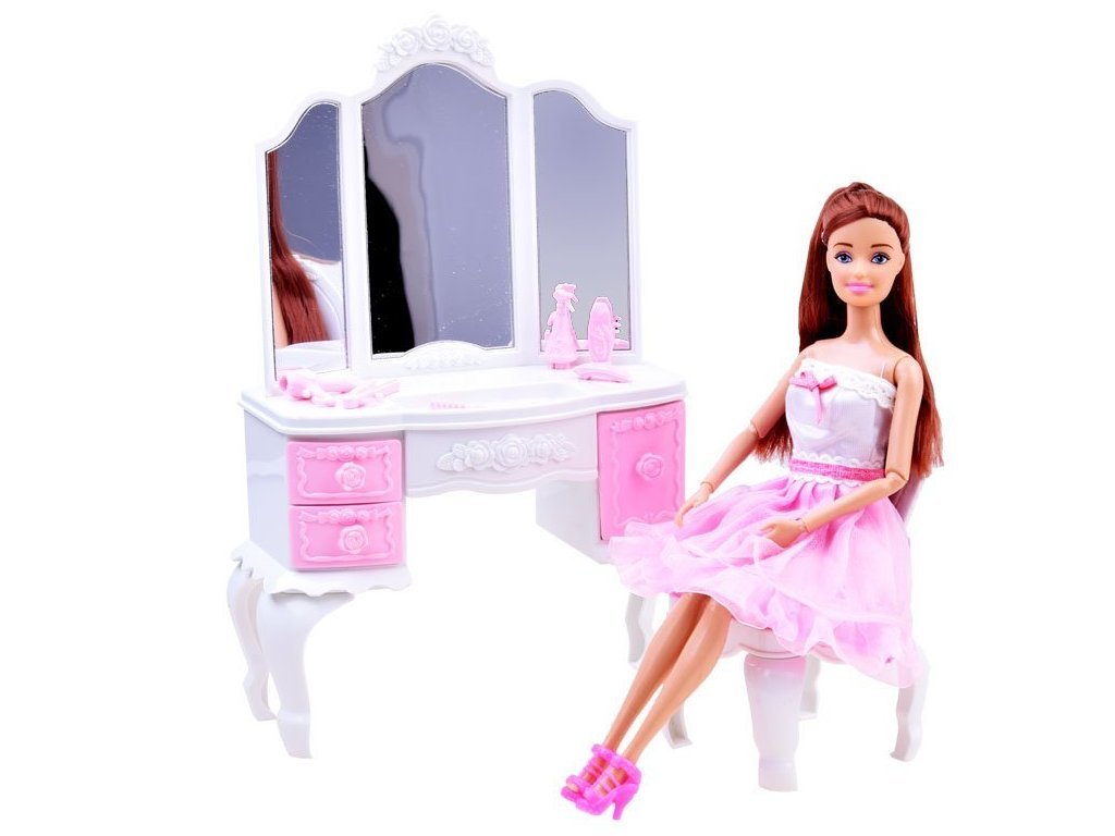 Okouzlující toaletní stolek s panenkou na hraní v kosmetickém salonu, kadeřnictví dá každé dívce spoustu zábavy. Hračka vyrobená s velkou pozorností k detailům. v okouzlující bílé a růžové barvě bude vypadat skvěle v domácím kosmetickém salonu.