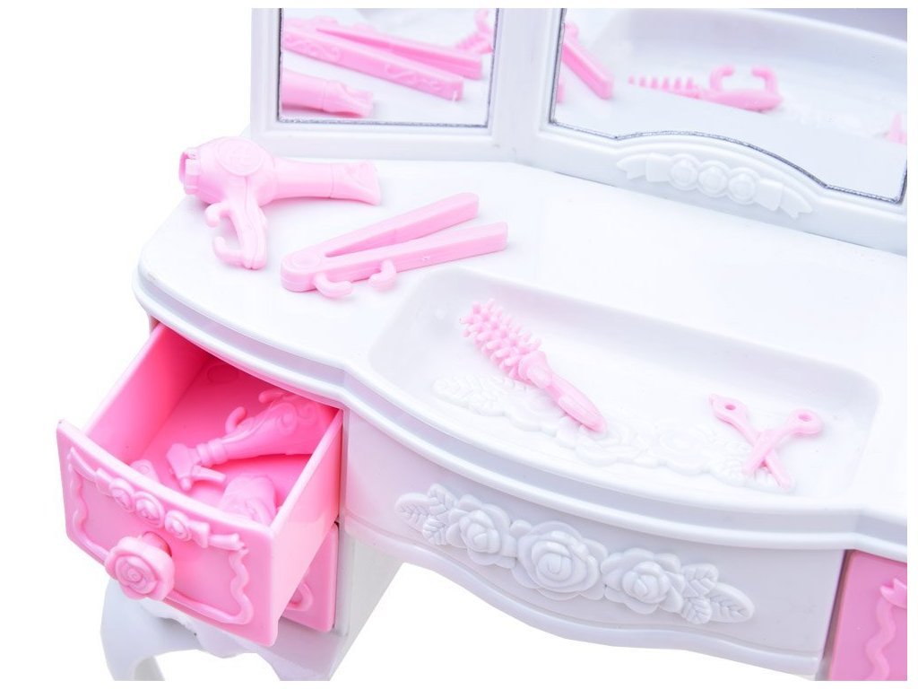 Toaletní stolek a židle jsou vyrobeny z plastu, efektivní provedení nábytku potěší každou dívku.Toaletní stolek má otevíratelné zásuvky, díky kterým můžete snadno skrýt potřebné doplňky, jako je sušička, kulma, nůžky atd.