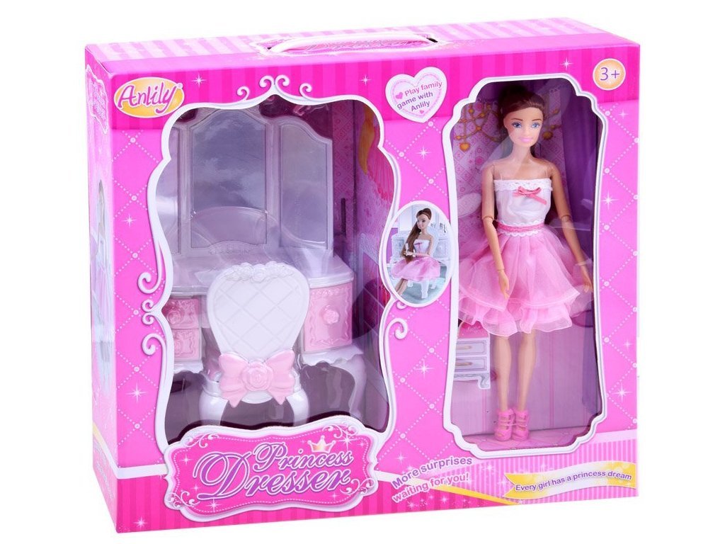 Panenka Anlily v elegantních šatech a toaletní stoleček s doplňky