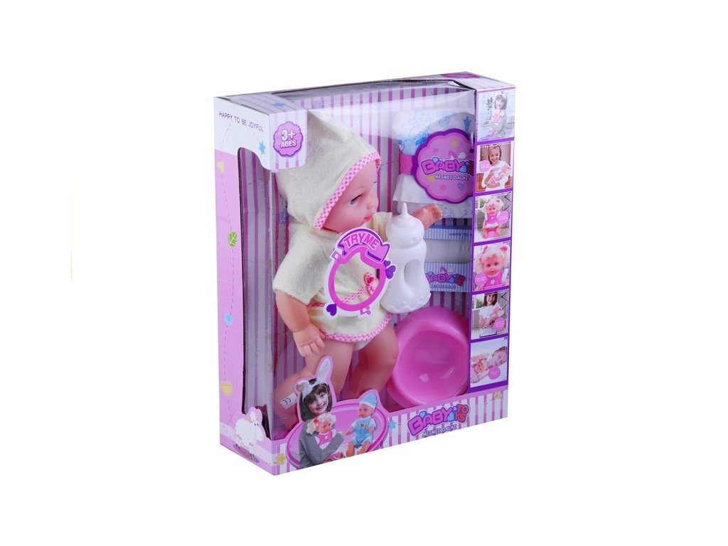 V sadě s panenkou jsou k dispozici doplňky potřebné pro péči o děti - pampers, kapesníky, láhev na mléko a nočník. Panenka má pohyblivé oční víčka, které se zavírají. Dokonce má panenka pohyblivé nohy a ruce - což výrazně zvyšuje atraktivitu hry. Hlavní výhodou hračky je však to, že po stisknutí břicha dítě uslyší veselou píseň.