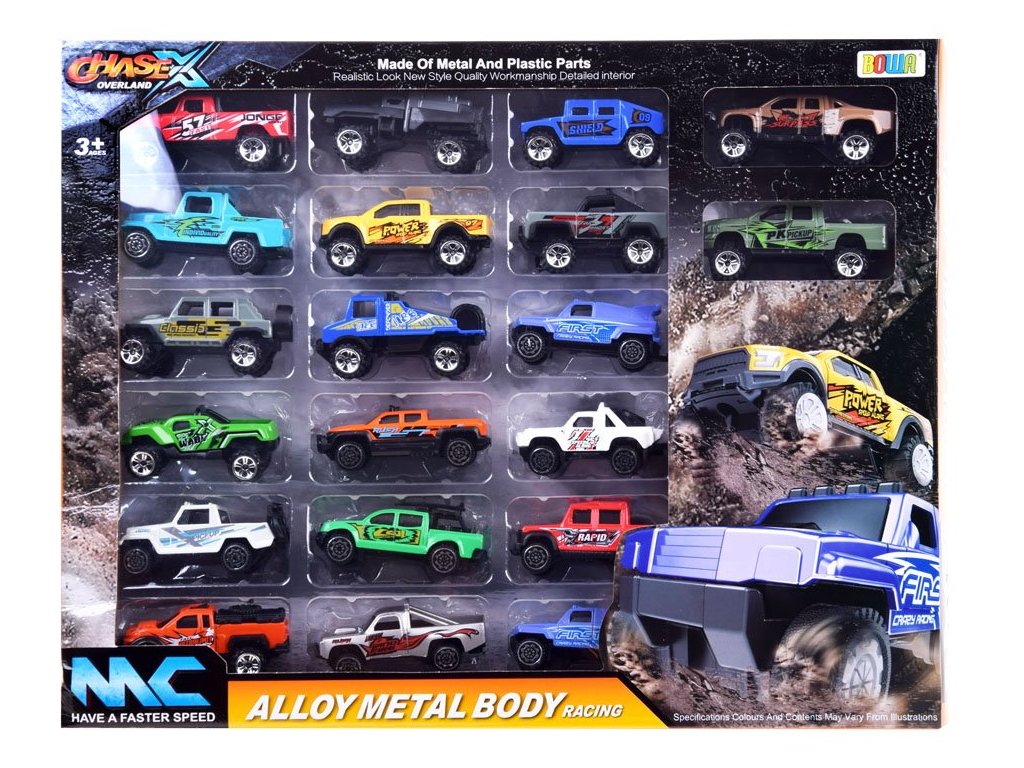 Sada kovových autíček obsahuje terénní automobily v různých barvách a stylech. Barva a grafika autíček je dokonale sladěna se siluetou vozidla: