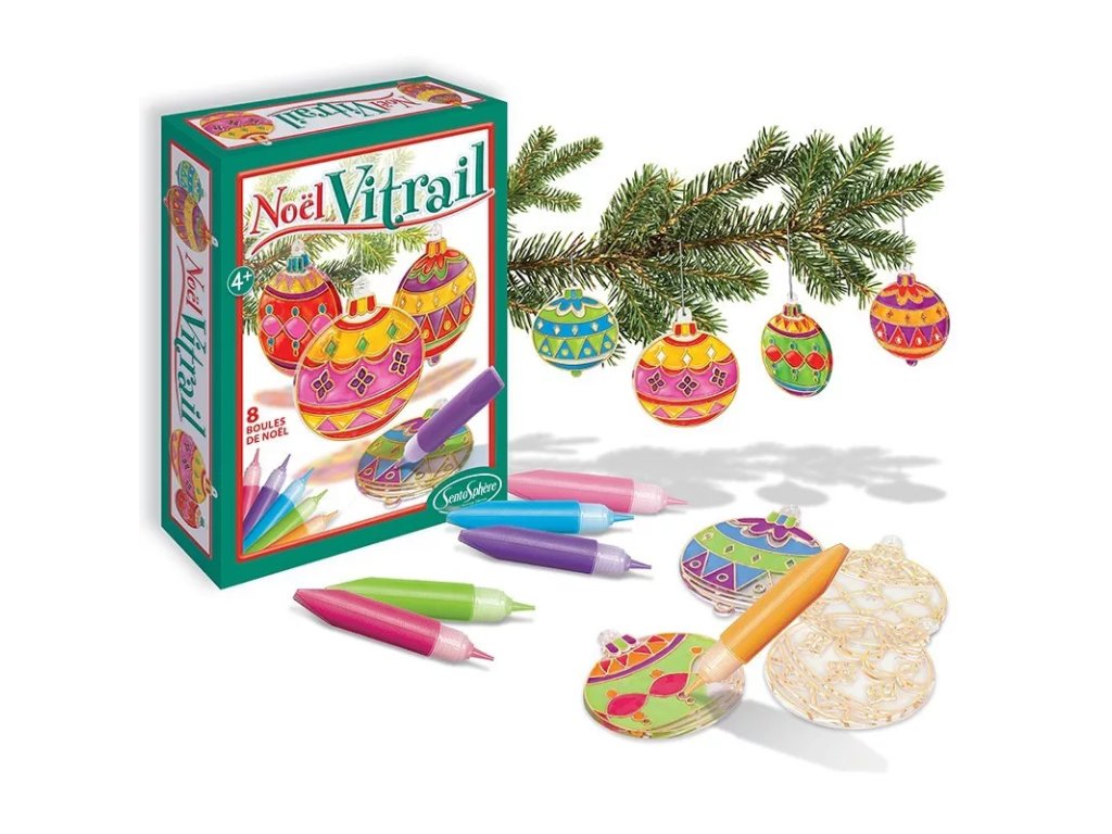 Kreativní sada pro vytváření vitrážových vánočních ozdob pomocí průsvitných barev na okna. Určeno k vybarvování předloh ve tvaru koulí; po zaschnutí vzniknou jasné a křišťálově průhledné dekorace vhodné k umístění na stromeček nebo do interiéru.