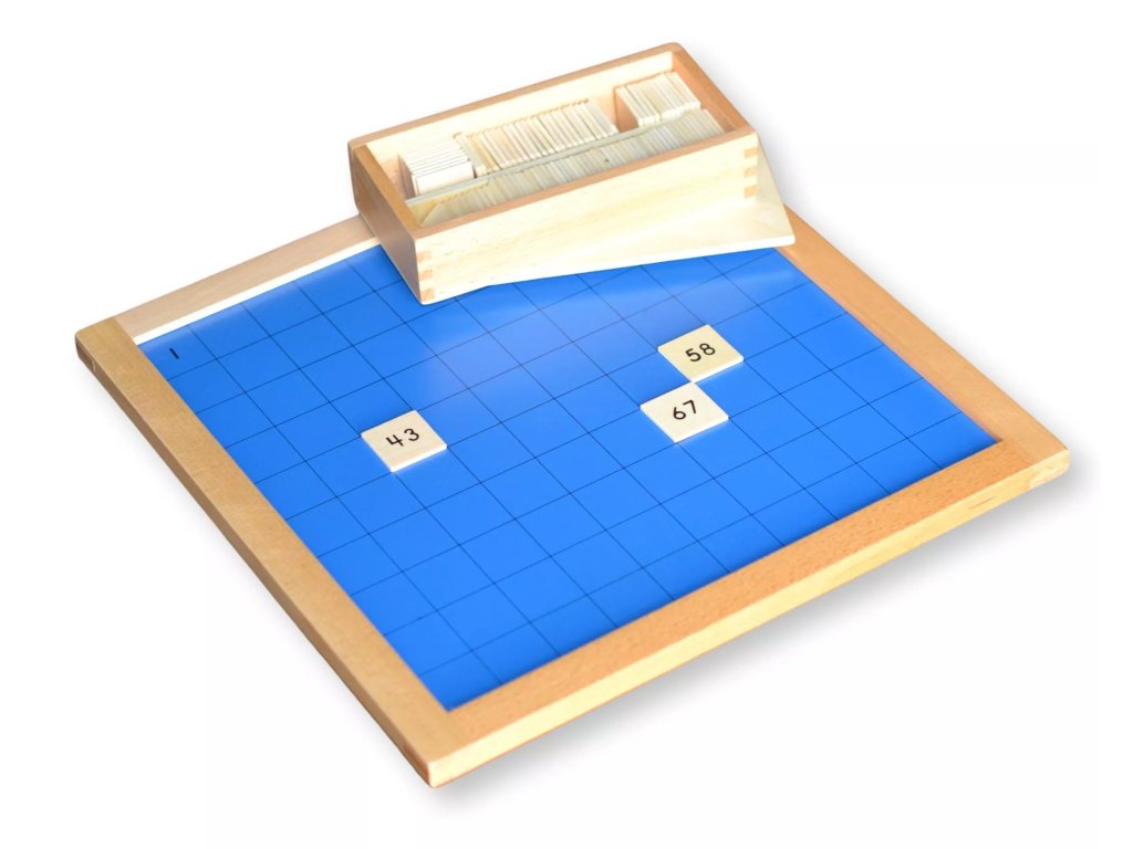 Modrá tabulka tvoří mřížku 10 × 10 bez vyplněných polí, kterou lze doplňovat jednotlivými číselnými prvky. K tabulce patří krabička se stovkou dřevěných čtverečků očíslovaných 1–100.