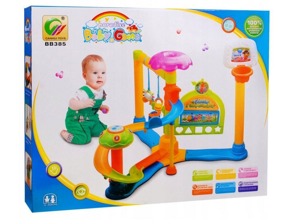 Multifunkční dětské hřiště, které se hodí jak do domu tak i na zahradu. Hračka je vyrobena z kvalitního, netoxického plastu. Celek je ve velmi hezkých živých barvách a nechybí zde ani zvukové efekty. Sada obsahuje míčky a basketbalový koš. Tento produkt si zamiluje každé dítě! Nuda zde jistě nehrozí. Hřiště napomáhá správnému rozvoji Vašeho dítěte, trénuje zde své manuální a koordinační schopností. Dítě se zde učí poznávat barvy a tvary.